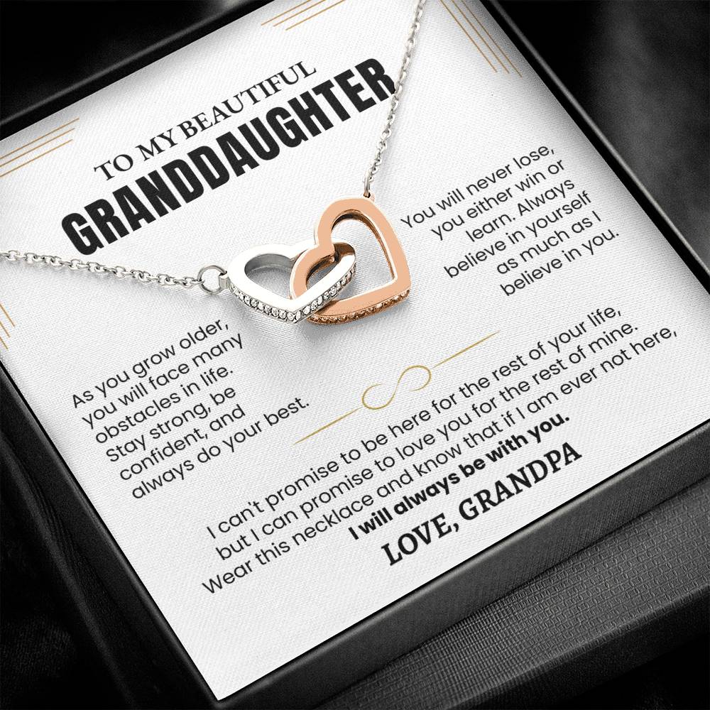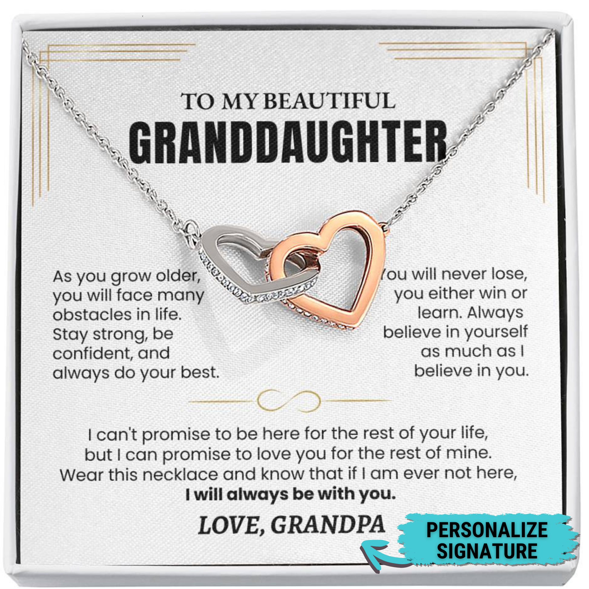 Imagine her reaction when she opens this beautiful gift. Give your granddaughter a reminder that you're always with her, even when you're miles apart. Two interlocking hearts shimmer together, just like your unbreakable bond, paired with a personalized message that feels like a warm hug from you. Perfect for birthdays, graduation, holidays, or just because you want her to know how deeply she's loved.