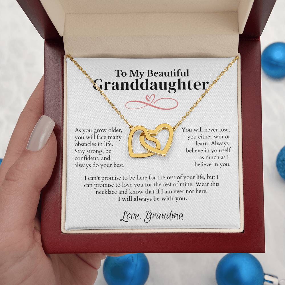 Imagine her reaction when she opens this beautiful gift. Give your granddaughter a reminder that you're always with her, even when you're miles apart. Two interlocking hearts shimmer together, just like your unbreakable bond, paired with a personalized message that feels like a warm hug from you. Perfect for birthdays, graduation, holidays, or just because you want her to know how deeply she's loved.